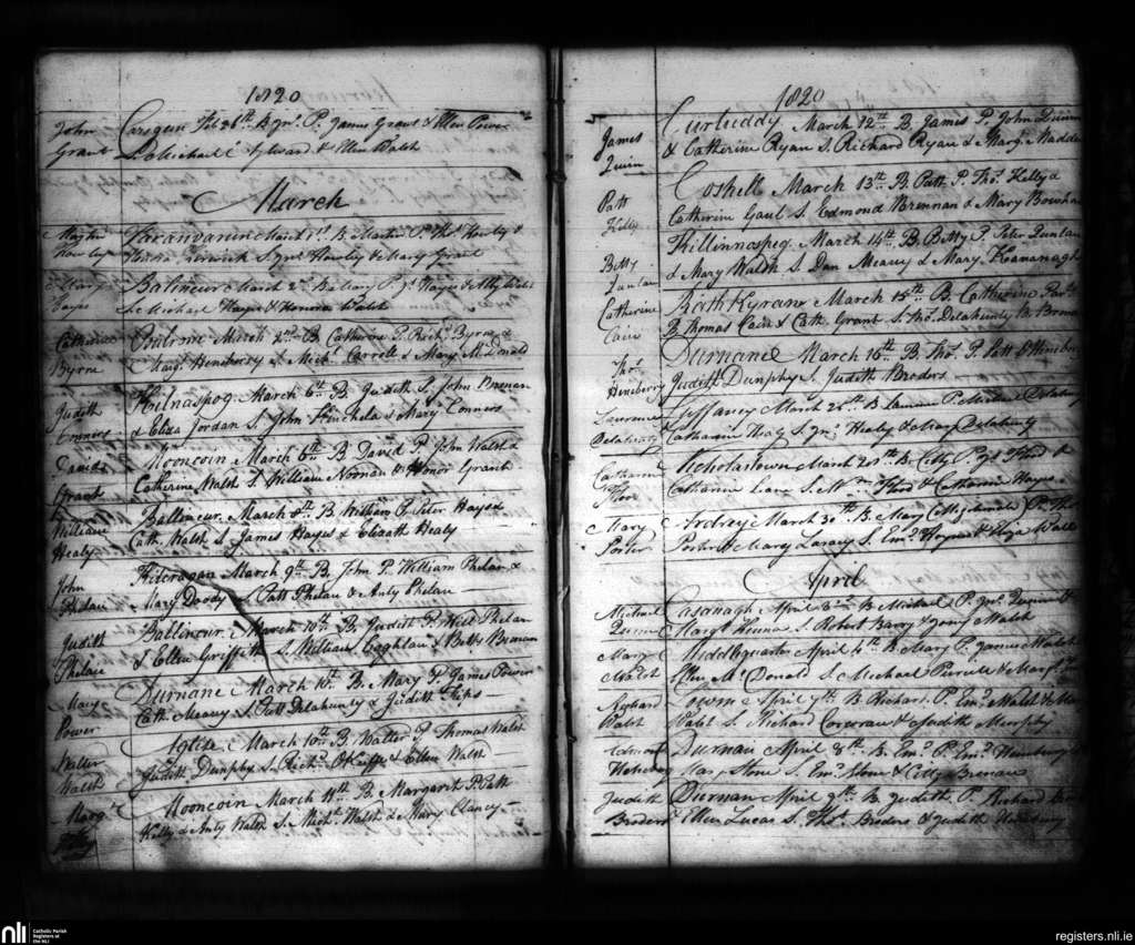 Carrigeen and Mooncoin; County of Kilkenny; Diocese of Ossory. Baptisms, Feb. 1820 to Apr. 1820