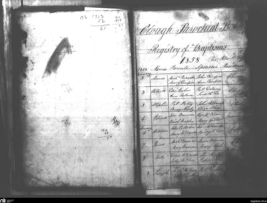 Clough; County of Kilkenny; Diocese of Ossory. Baptisms, Jan. 1858 to Feb. 1858