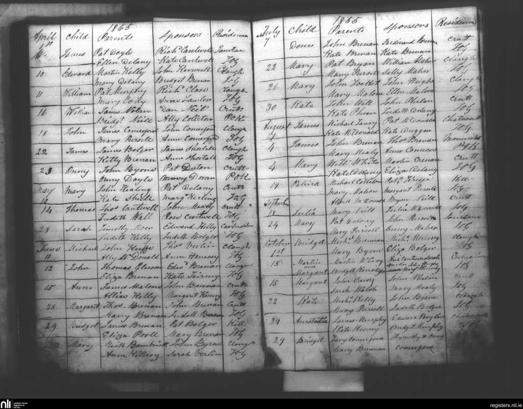 Clough; County of Kilkenny; Diocese of Ossory. Baptisms, Apr. 1865 to Oct. 1865