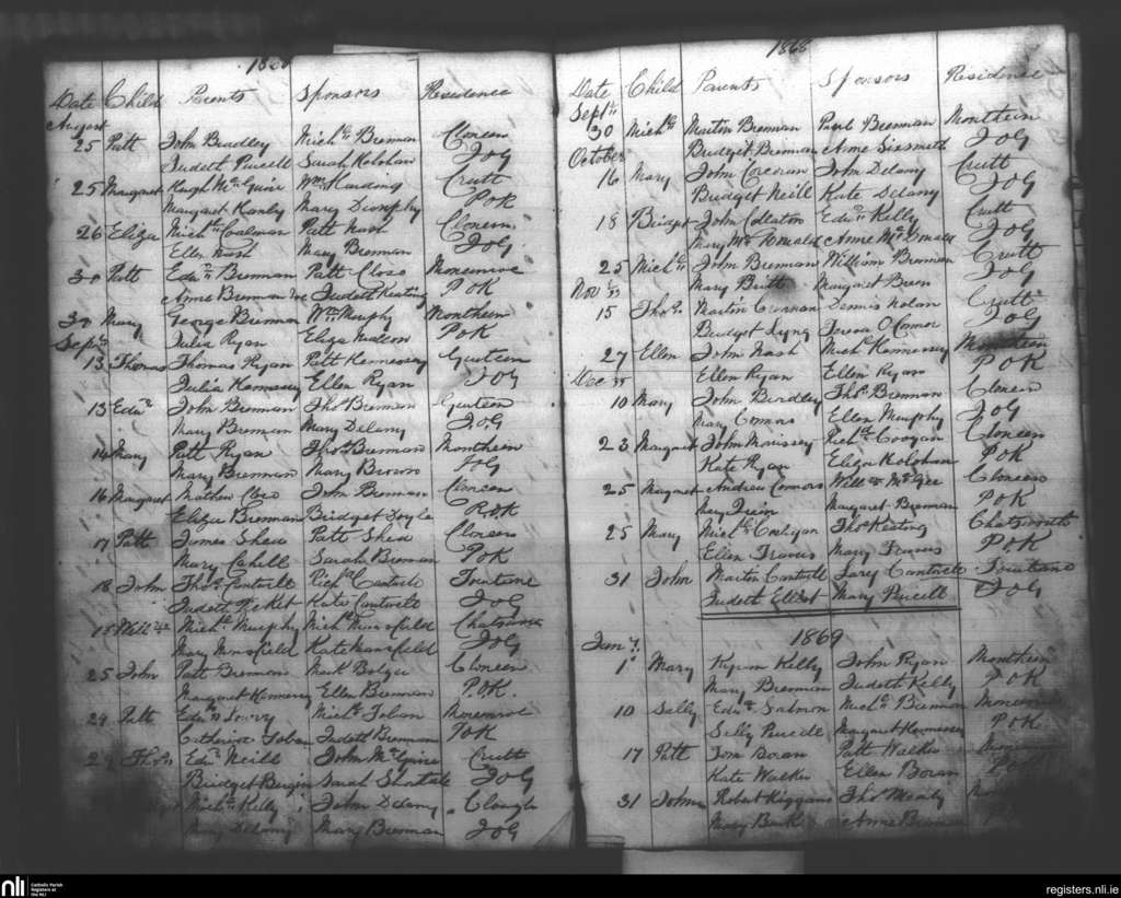 Clough; County of Kilkenny; Diocese of Ossory. Baptisms, Aug. 1868 to Jan. 1869