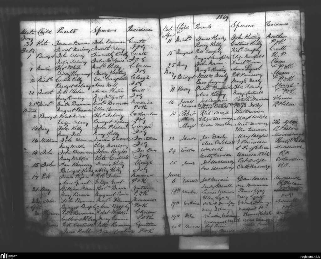 Clough; County of Kilkenny; Diocese of Ossory. Baptisms, Jan. 1869 to June 1869