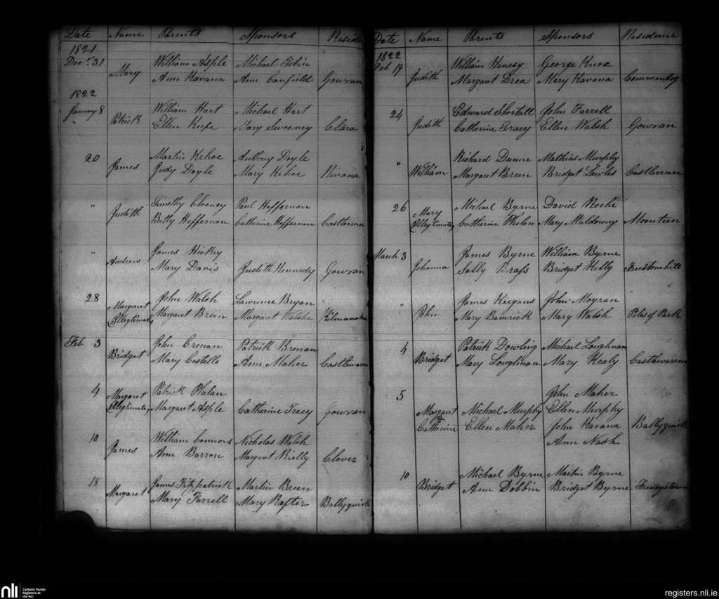 Gowran; County of Kilkenny; Diocese of Ossory. Baptisms, Dec. 1821 to Mar. 1822