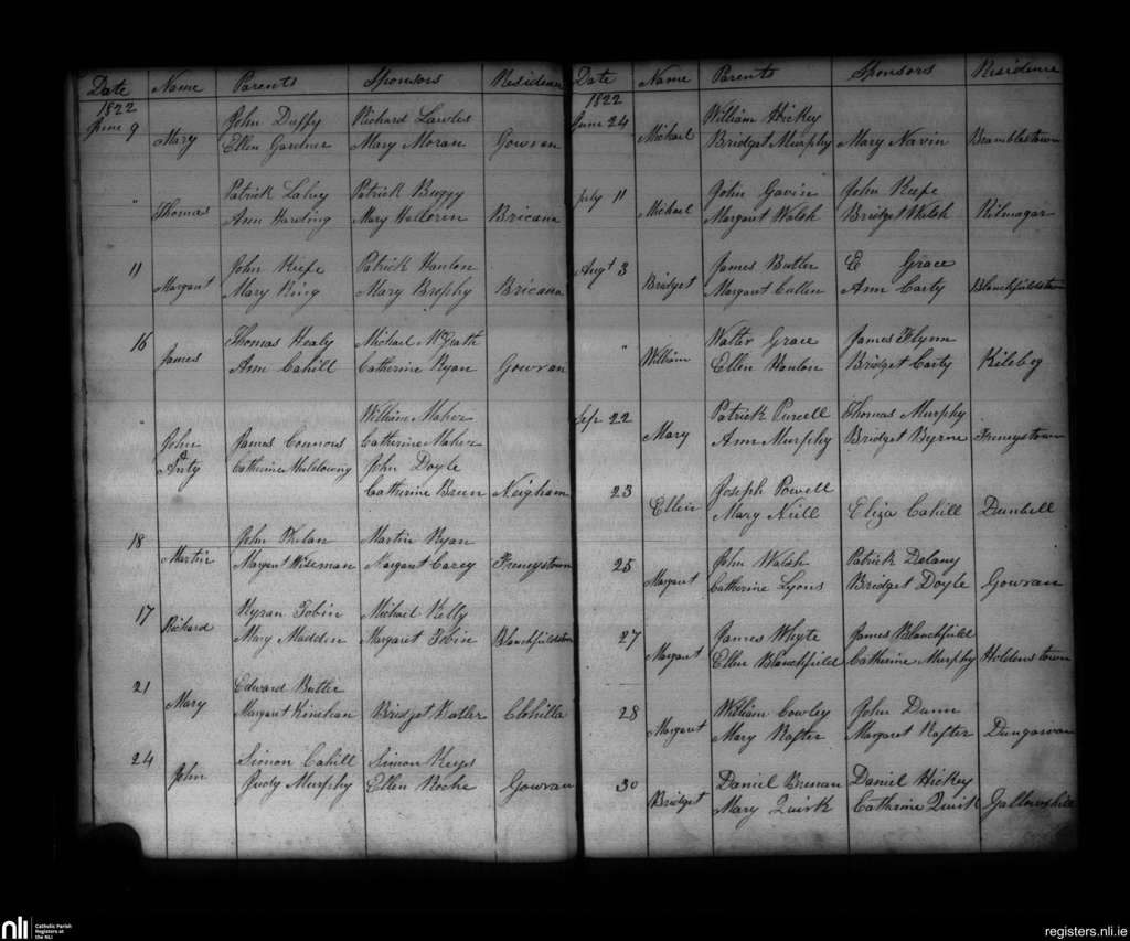 Gowran; County of Kilkenny; Diocese of Ossory. Baptisms, June 1822 to Sep. 1822