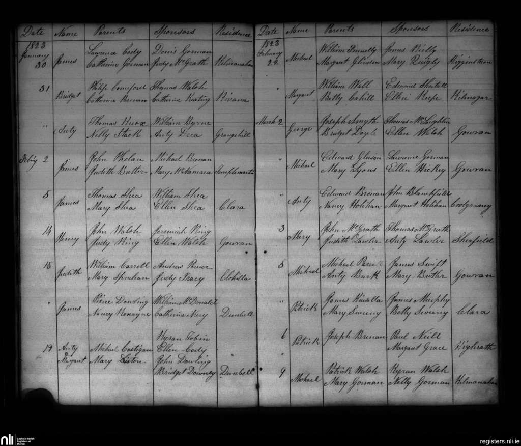 Gowran; County of Kilkenny; Diocese of Ossory. Baptisms, Jan. 1823 to Mar. 1823