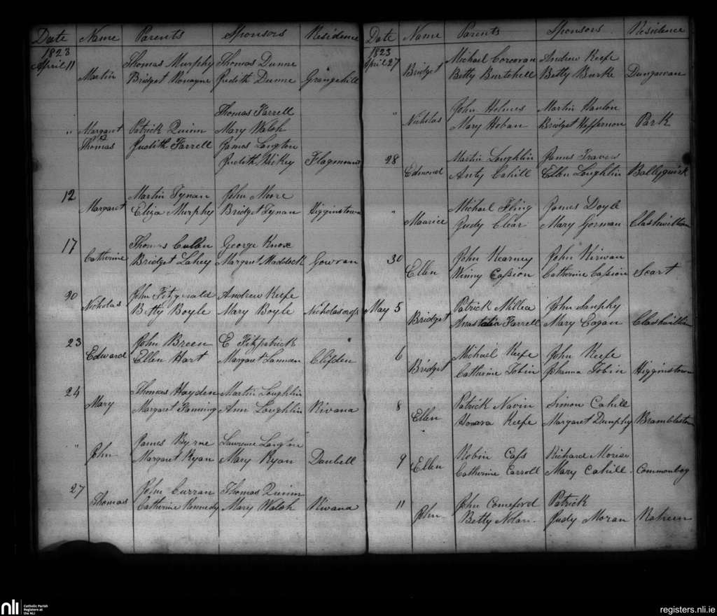 Gowran; County of Kilkenny; Diocese of Ossory. Baptisms, Apr. 1823 to May 1823