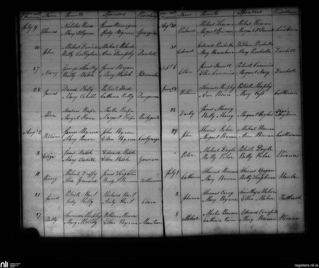 Gowran; County of Kilkenny; Diocese of Ossory. Baptisms, July 1820 to July 1821