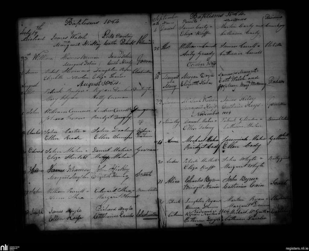 Gowran; County of Kilkenny; Diocese of Ossory. Baptisms, July 1854 to Nov. 1854