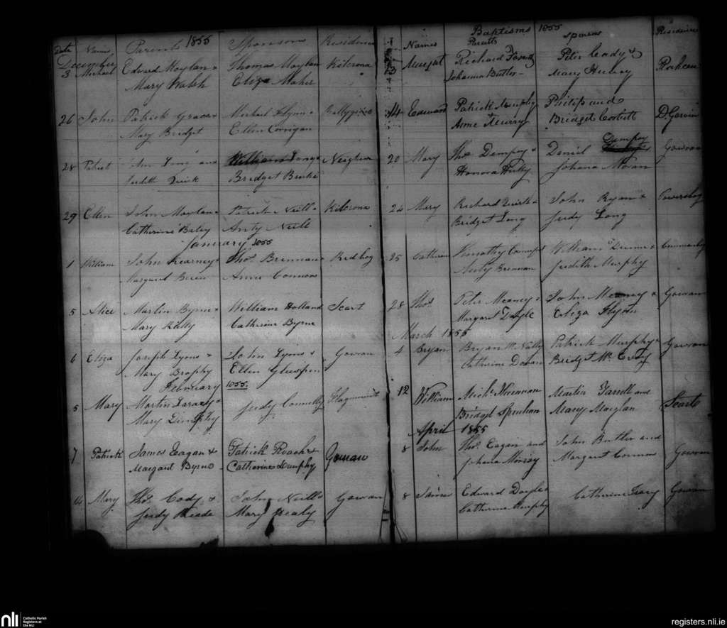 Gowran; County of Kilkenny; Diocese of Ossory. Baptisms, Dec. 1854 to Apr. 1855