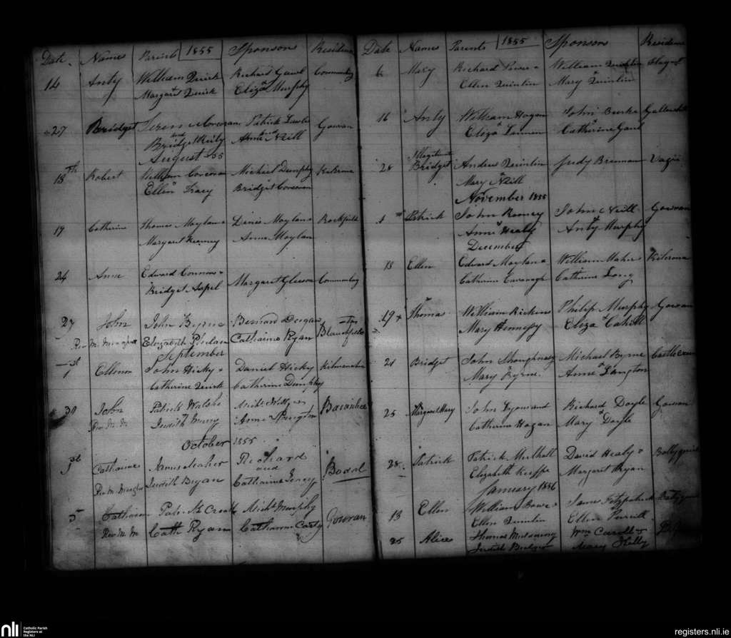 Gowran; County of Kilkenny; Diocese of Ossory. Baptisms, July 1855 to Jan. 1856
