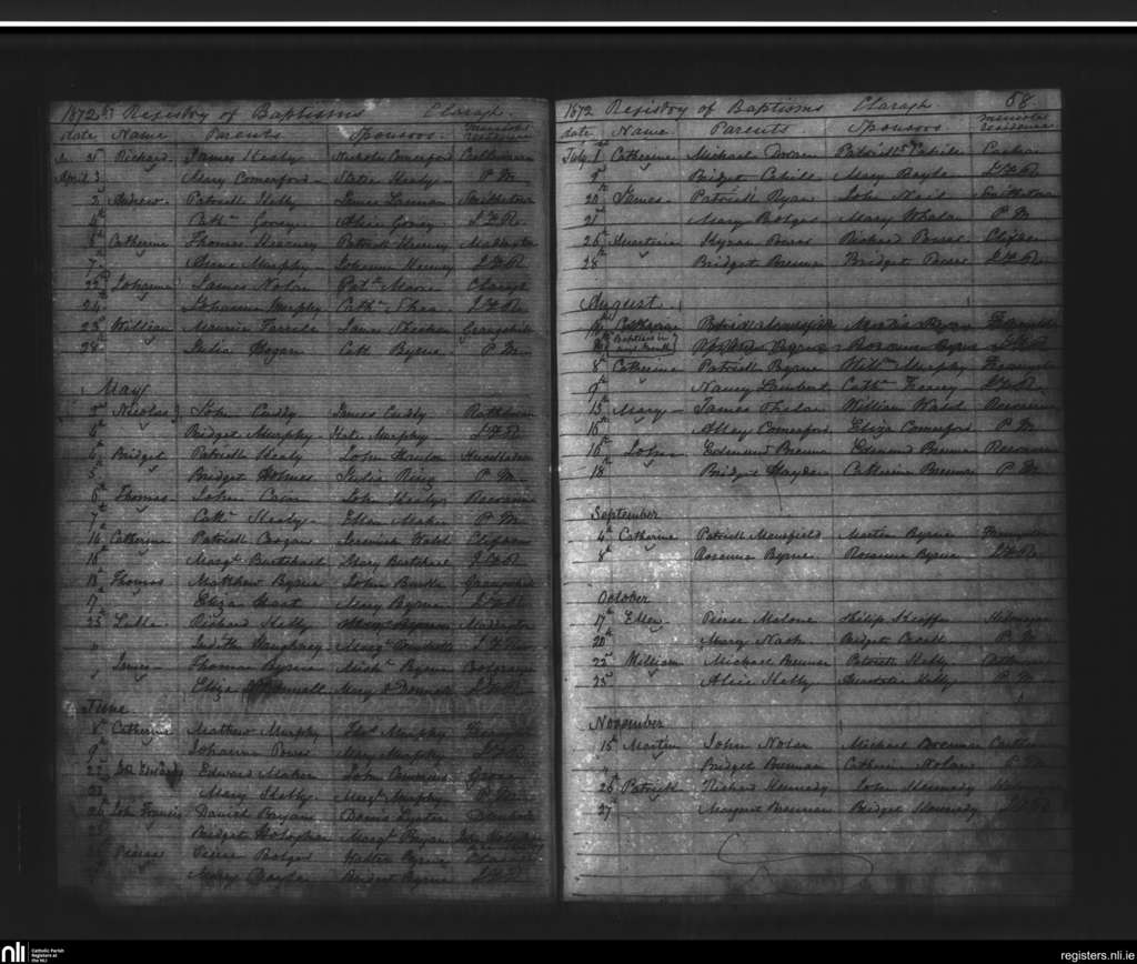 Pitt; County of Kilkenny; Diocese of Ossory. Baptisms, Mar. 1872 to Nov. 1872