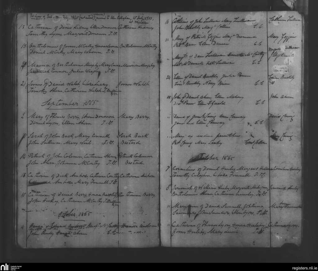 Tracton Abbey; County of Cork; Diocese of Cork and Ross. Baptisms, Aug. 1865 to Oct. 1865