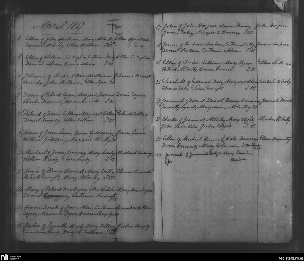 Tracton Abbey; County of Cork; Diocese of Cork and Ross. Baptisms, Apr. 1867