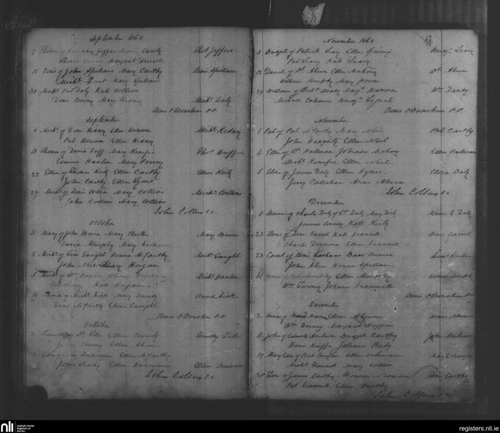 Tracton Abbey; County of Cork; Diocese of Cork and Ross. Baptisms, Sep. 1868 to Dec. 1868