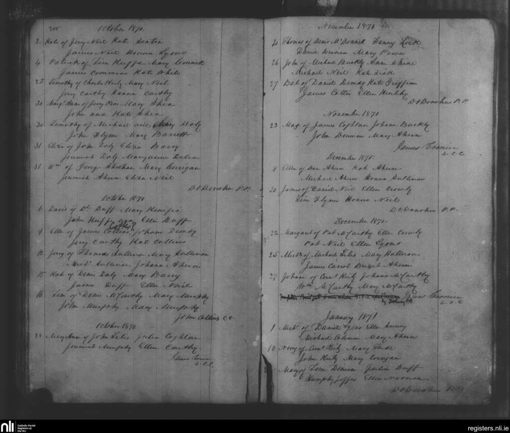 Tracton Abbey; County of Cork; Diocese of Cork and Ross. Baptisms, Oct. 1870 to Jan. 1871