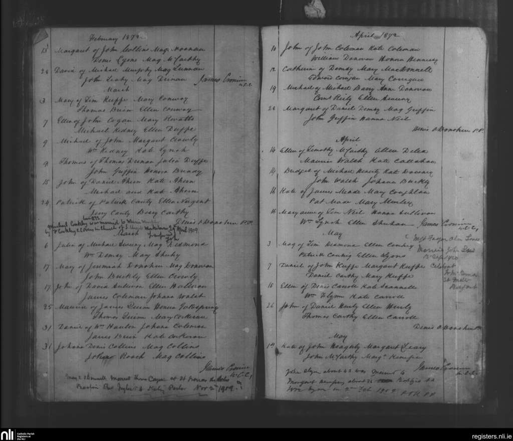Tracton Abbey; County of Cork; Diocese of Cork and Ross. Baptisms, Feb. 1872 to May 1872