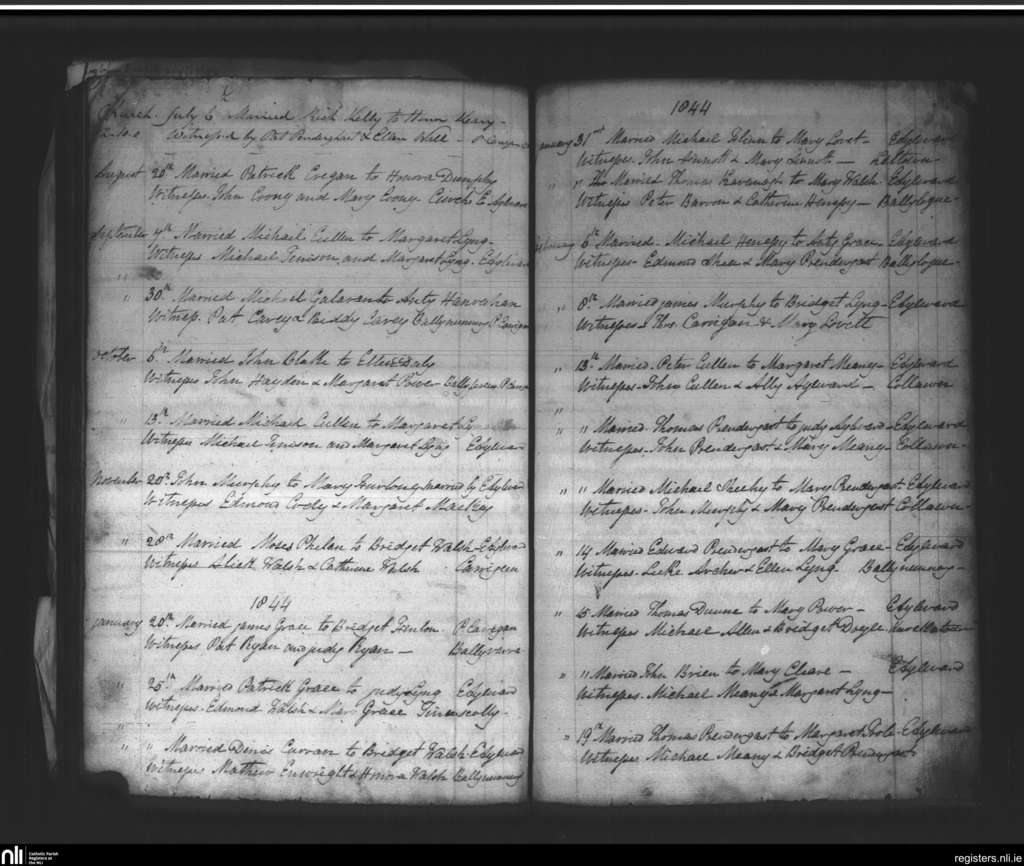 Inistioge; County of Kilkenny; Diocese of Ossory. Marriages, July 1843 to Feb. 1844