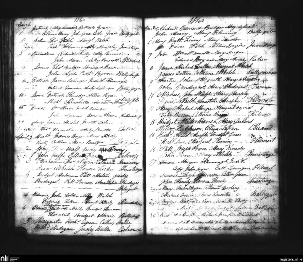 Inistioge; County of Kilkenny; Diocese of Ossory. Baptisms, Mar. 1840 to Apr. 1840