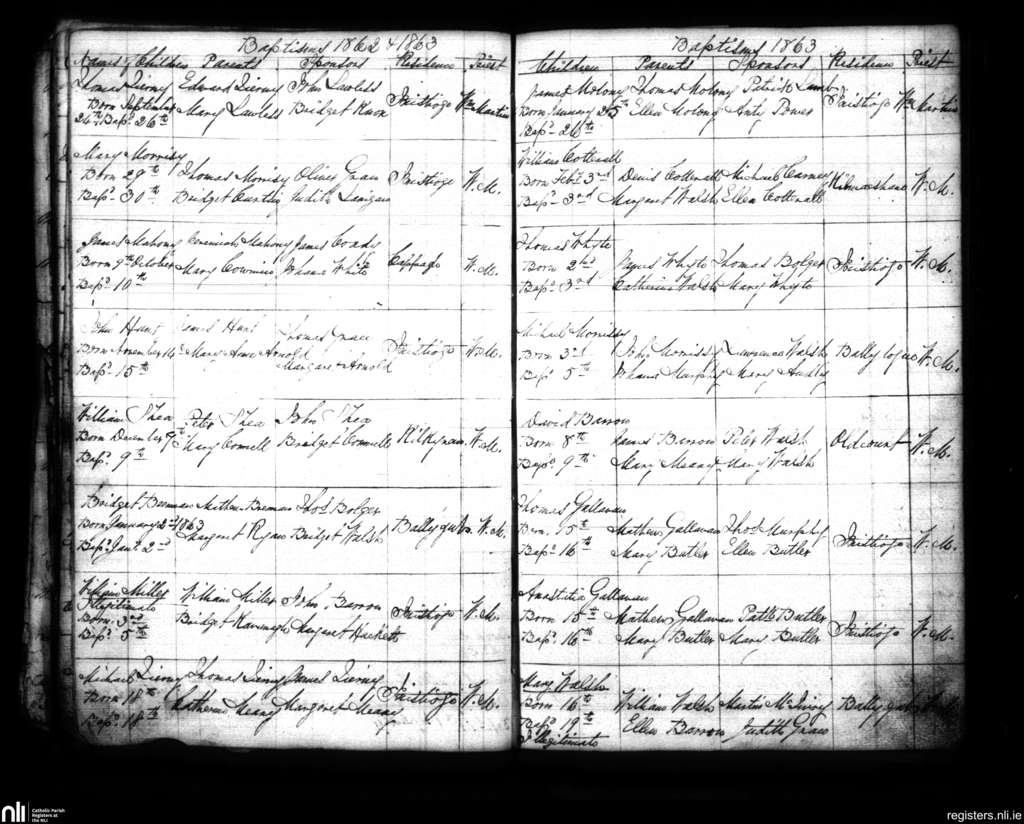 Inistioge; County of Kilkenny; Diocese of Ossory. Baptisms, Sep. 1862 to Feb. 1863