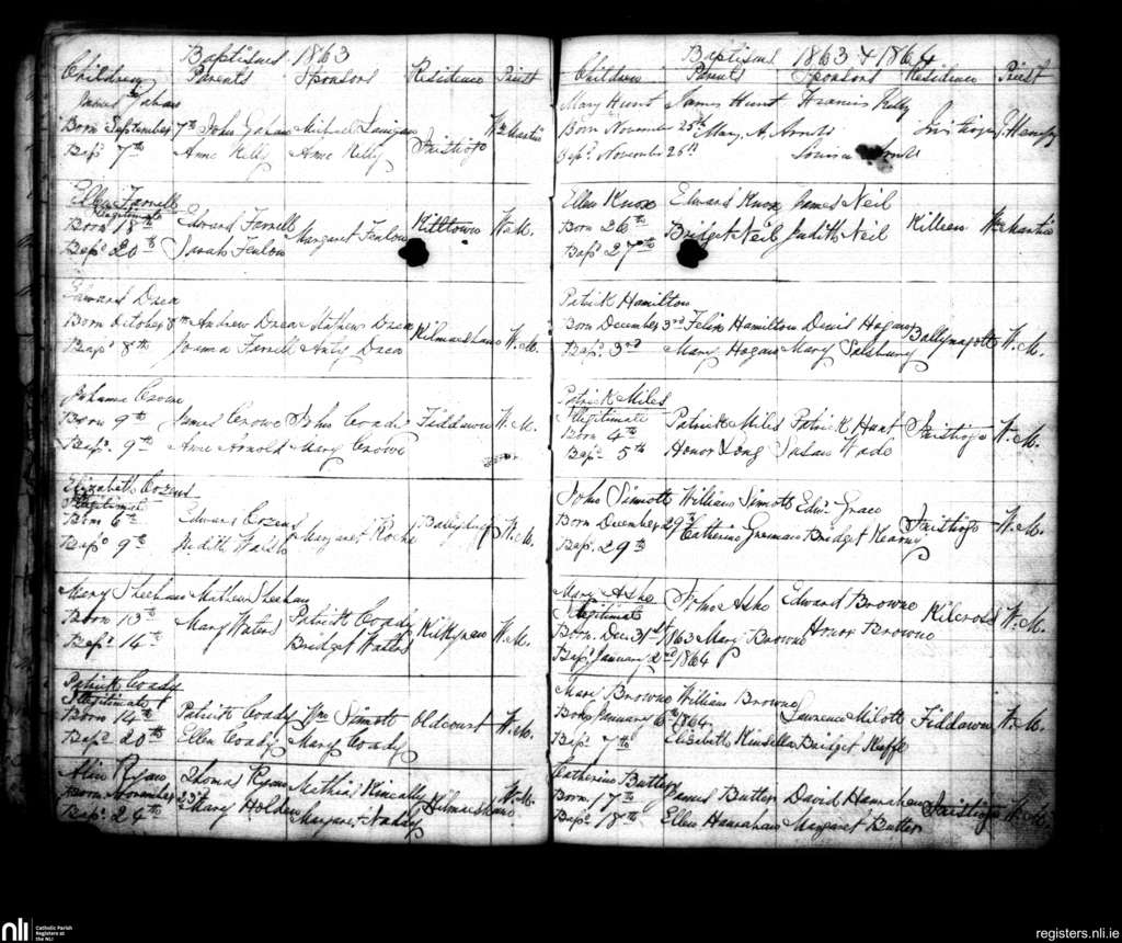 Inistioge; County of Kilkenny; Diocese of Ossory. Baptisms, Sep. 1863 to Jan. 1864