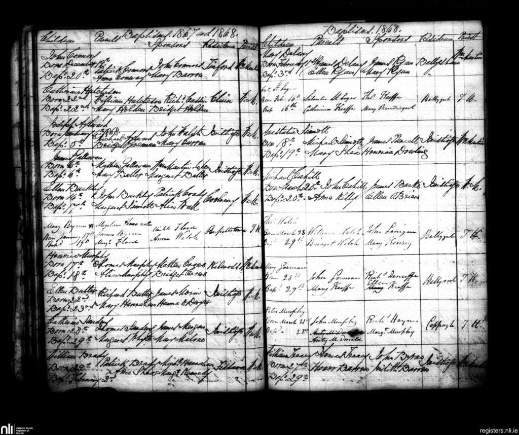 Inistioge; County of Kilkenny; Diocese of Ossory. Baptisms, Dec. 1867 to Mar. 1868
