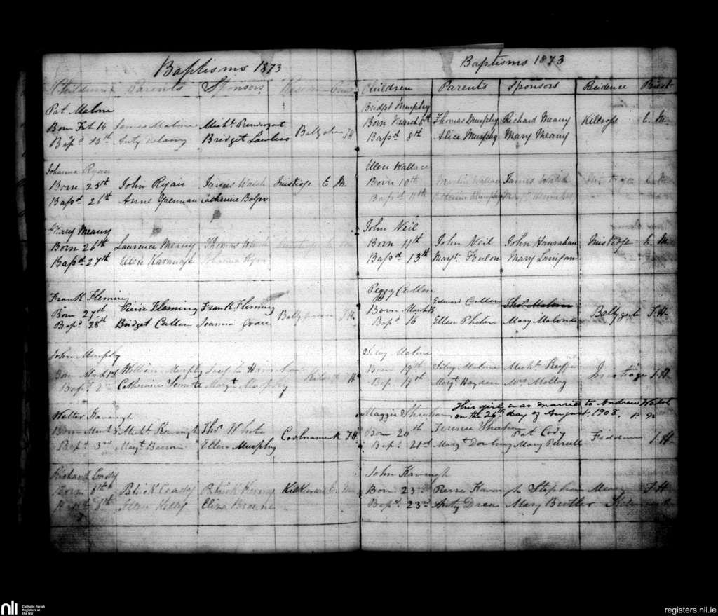 Inistioge; County of Kilkenny; Diocese of Ossory. Baptisms, Feb. 1873 to Mar. 1873