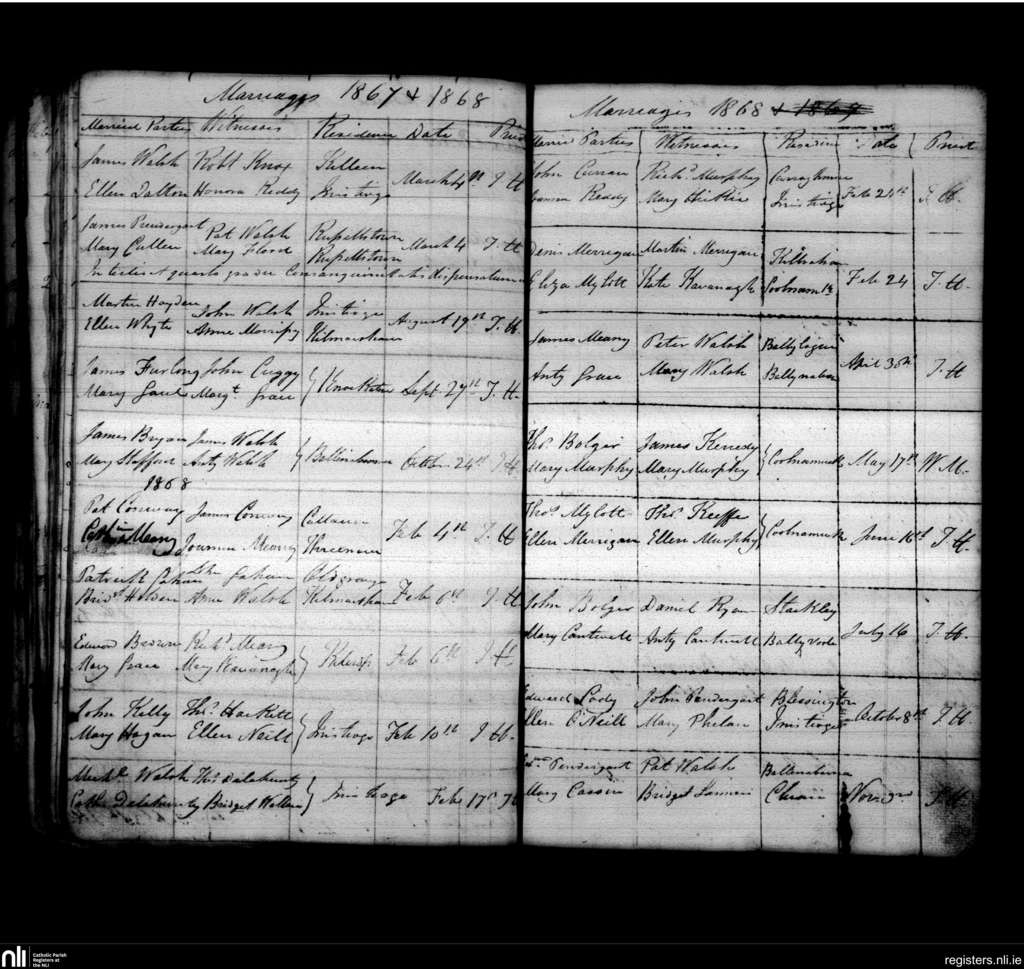 Inistioge; County of Kilkenny; Diocese of Ossory. Marriages, Feb. 1867 to Nov. 1868