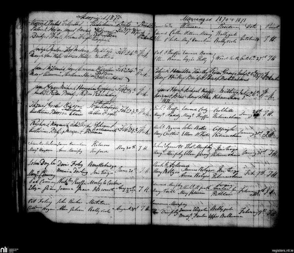 Inistioge; County of Kilkenny; Diocese of Ossory. Marriages, Feb. 1870 to Feb. 1871