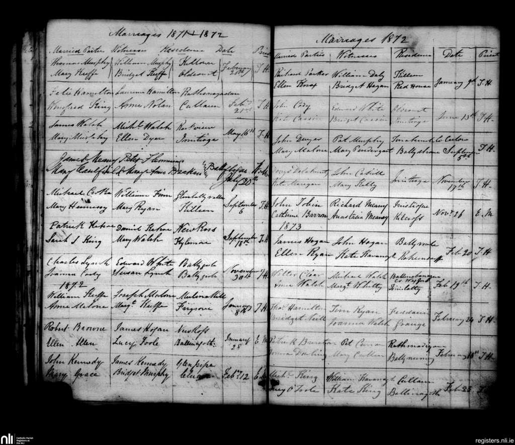 Inistioge; County of Kilkenny; Diocese of Ossory. Marriages, Feb. 1871 to Feb. 1873