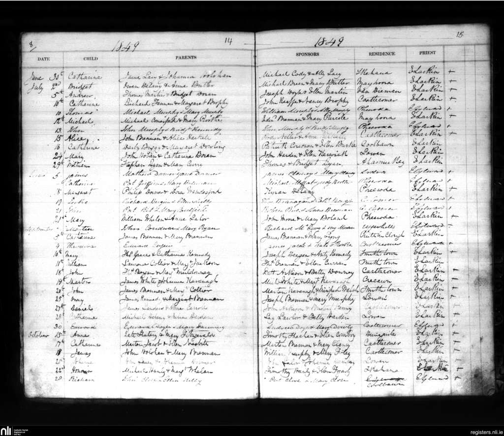 Castlecomer; County of Kilkenny; Diocese of Ossory. Baptisms, June 1849 to Oct. 1849