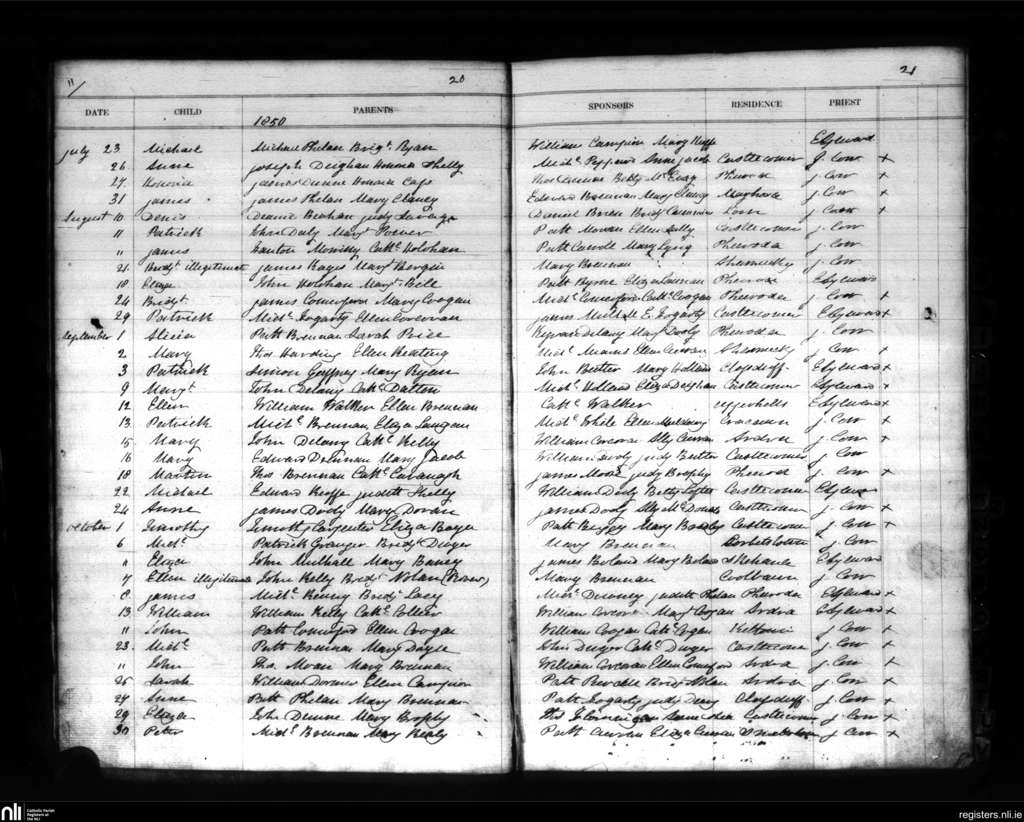 Castlecomer; County of Kilkenny; Diocese of Ossory. Baptisms, July 1850 to Oct. 1850