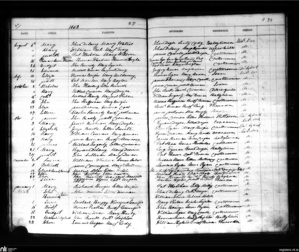 Castlecomer; County of Kilkenny; Diocese of Ossory. Baptisms, Aug. 1853 to Jan. 1854