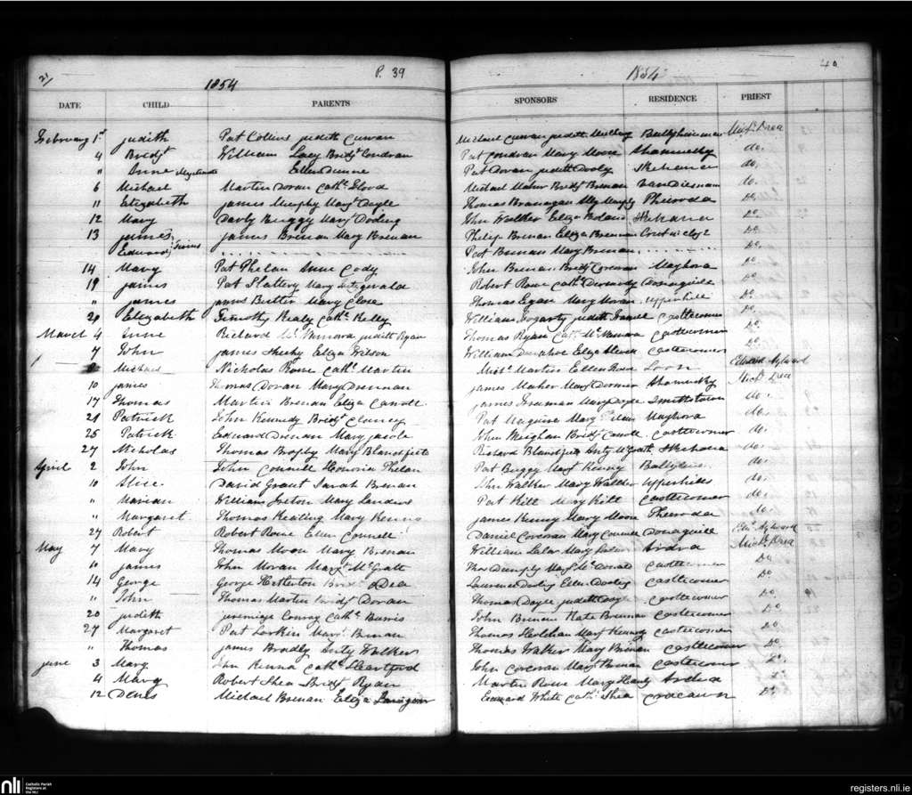 Castlecomer; County of Kilkenny; Diocese of Ossory. Baptisms, Feb. 1854 to June 1854