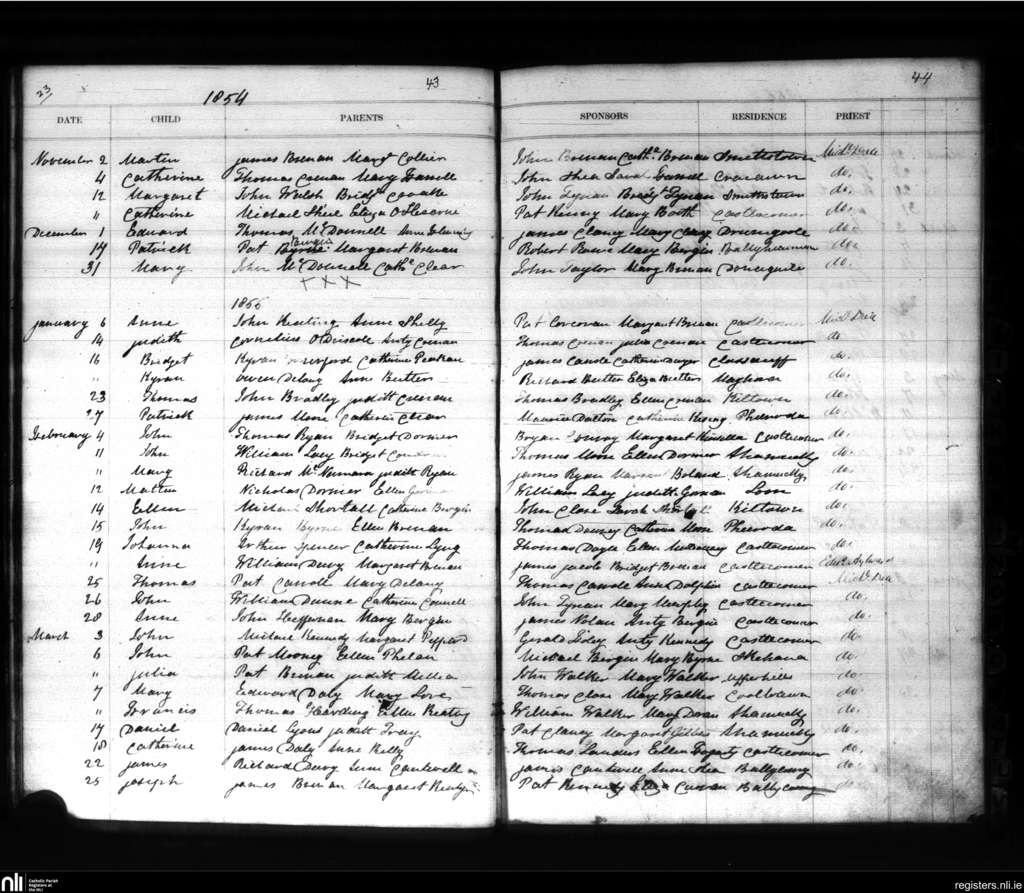 Castlecomer; County of Kilkenny; Diocese of Ossory. Baptisms, Nov. 1854 to Mar. 1855