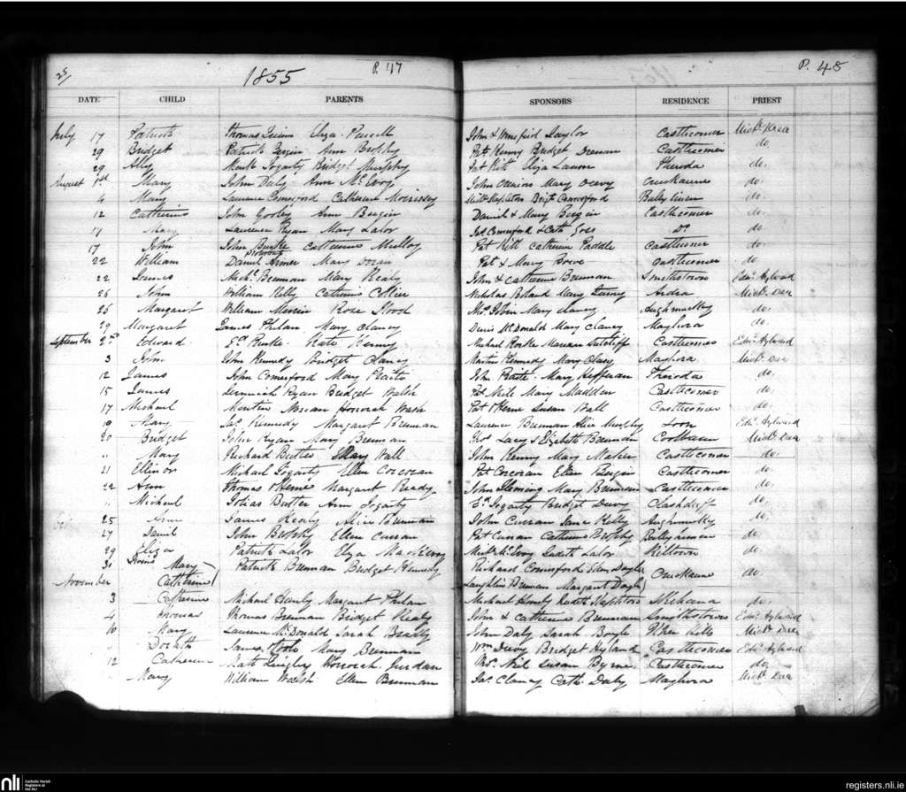 Castlecomer; County of Kilkenny; Diocese of Ossory. Baptisms, July 1855 to Nov. 1855
