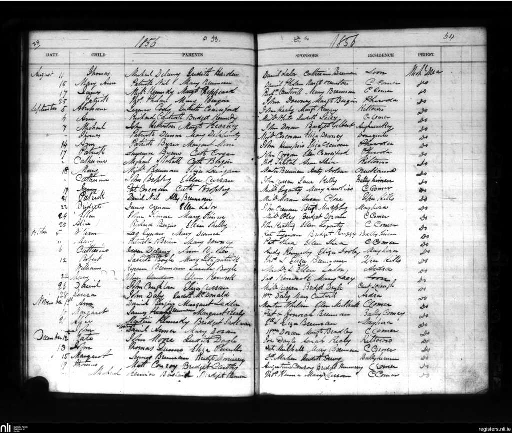 Castlecomer; County of Kilkenny; Diocese of Ossory. Baptisms, Aug. 1856 to Dec. 1856