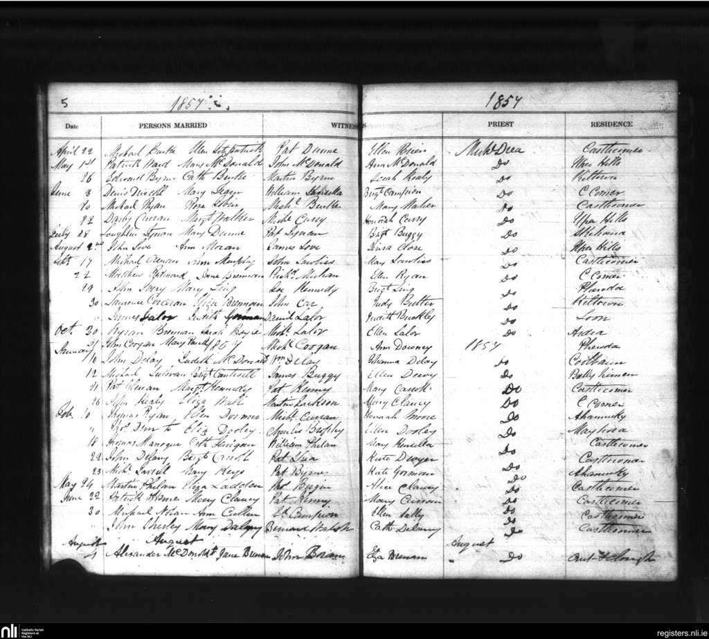 Castlecomer; County of Kilkenny; Diocese of Ossory. Marriages, Apr. 1856 to Aug. 1857