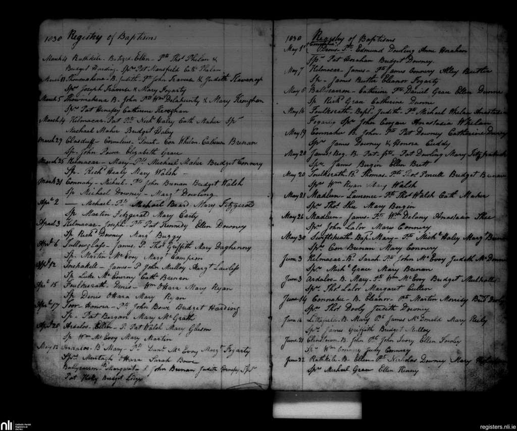 Conahy; County of Kilkenny; Diocese of Ossory. Baptisms, Mar. 1838 to June 1838