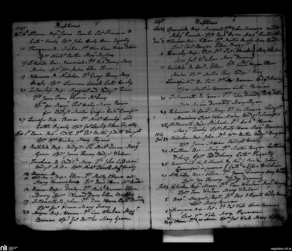 Conahy; County of Kilkenny; Diocese of Ossory. Baptisms, Oct. 1845 to Feb. 1846