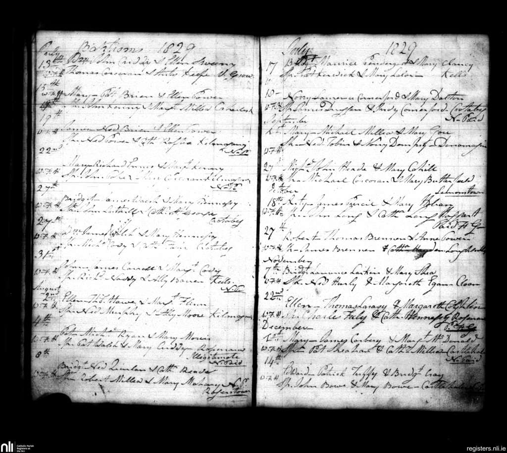 Dunamaggan; County of Kilkenny; Diocese of Ossory. Baptisms, July 1829 to Dec. 1829
