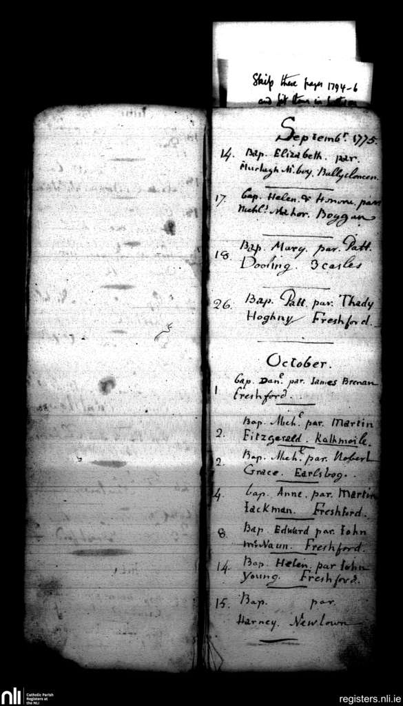 Freshford; County of Kilkenny; Diocese of Ossory. Baptisms, Sep. 1775 to Oct. 1775