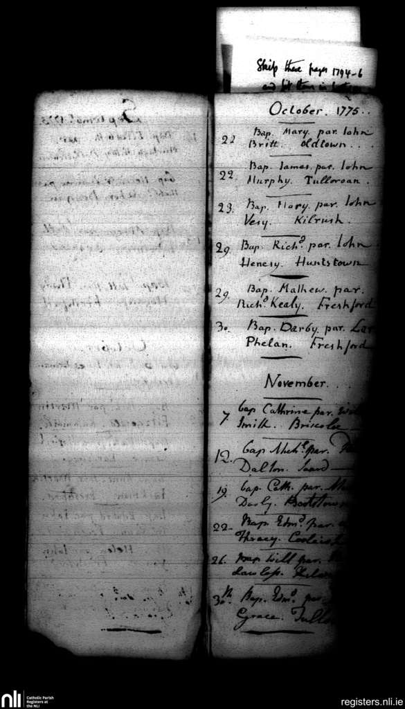 Freshford; County of Kilkenny; Diocese of Ossory. Baptisms, Oct. 1775 to Nov. 1775