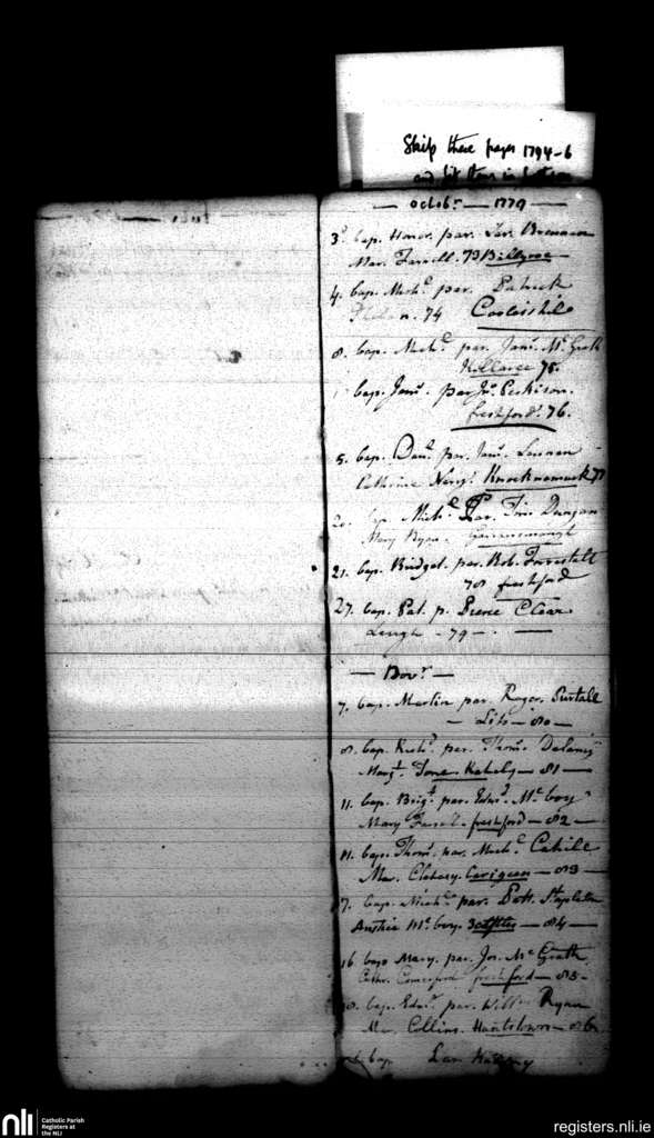 Freshford; County of Kilkenny; Diocese of Ossory. Baptisms, Oct. 1779 to Nov. 1779