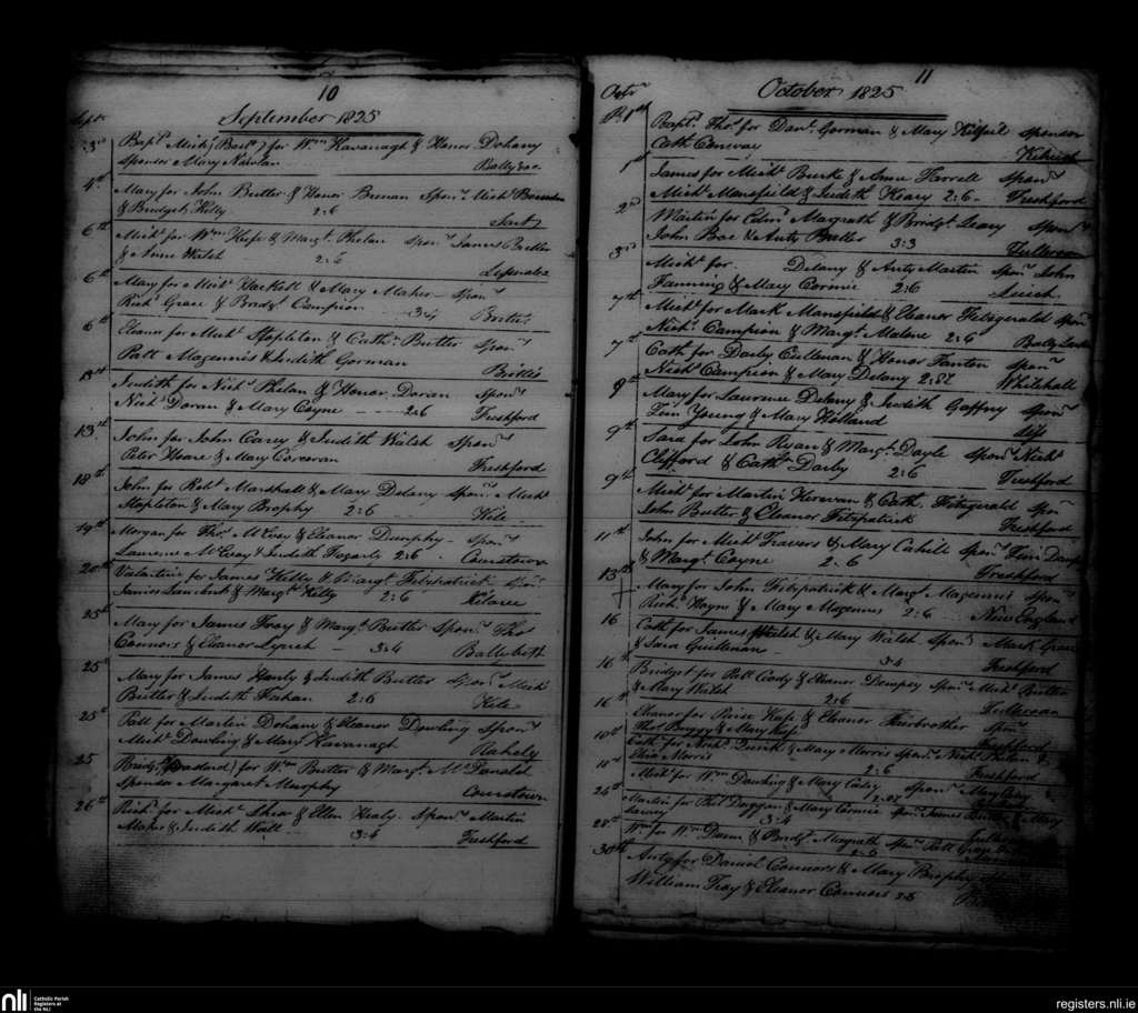 Freshford; County of Kilkenny; Diocese of Ossory. Baptisms, Sep. 1825 to Oct. 1825