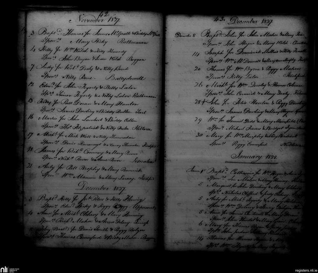 Freshford; County of Kilkenny; Diocese of Ossory. Baptisms, Nov. 1827 to Jan. 1828