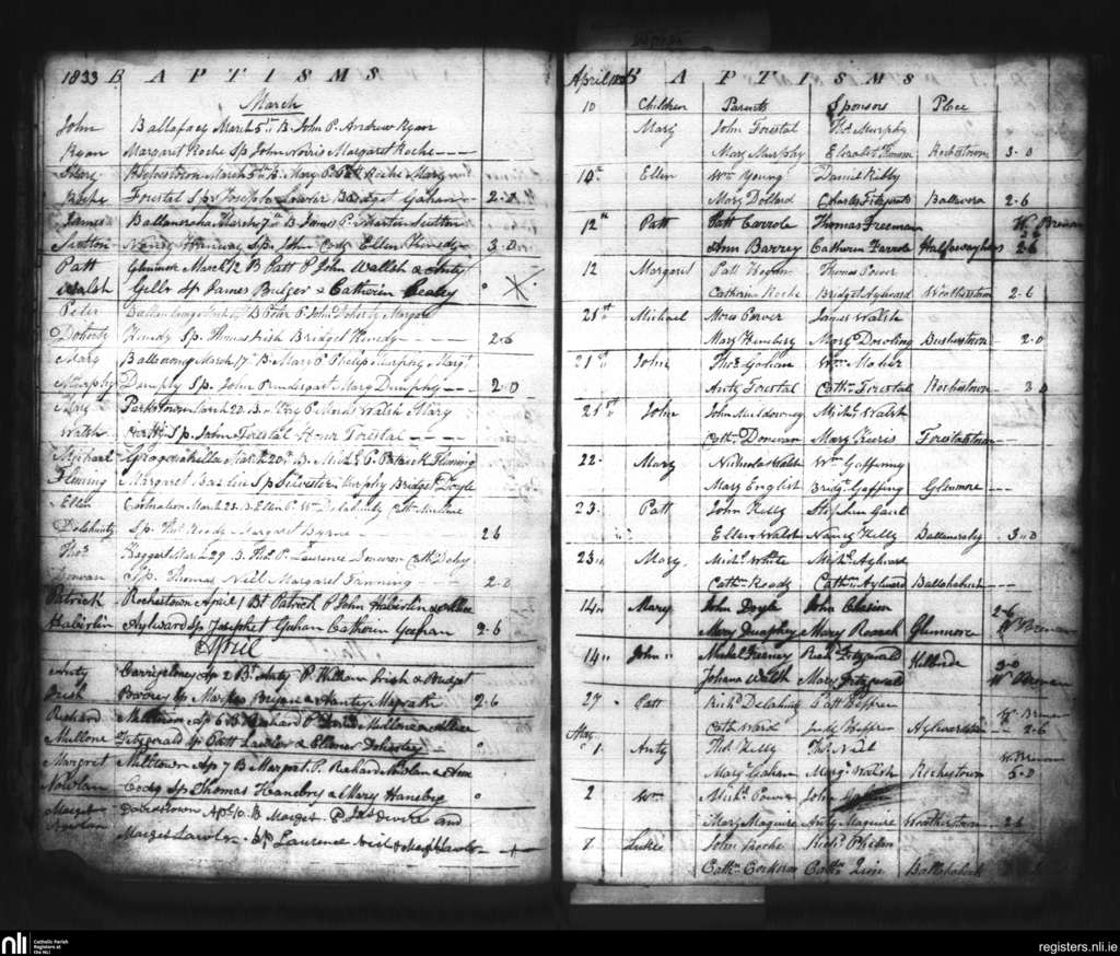 Glenmore; County of Kilkenny; Diocese of Ossory. Baptisms, Mar. 1833 to May 1833