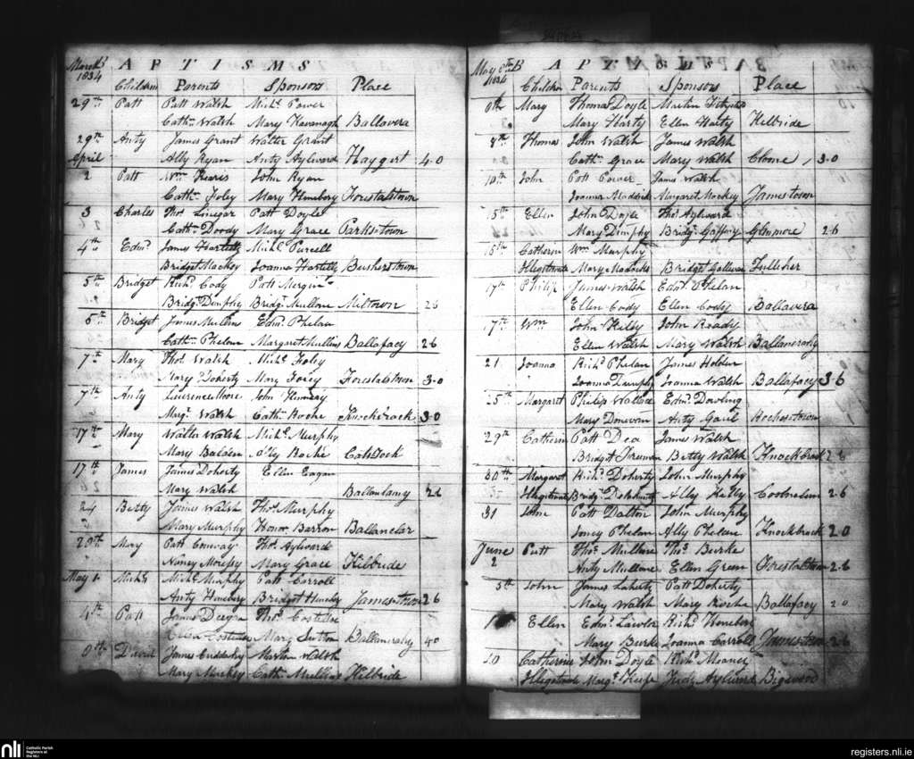 Glenmore; County of Kilkenny; Diocese of Ossory. Baptisms, Mar. 1834 to June 1834
