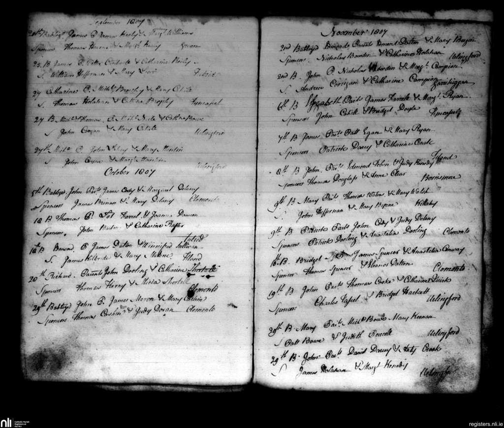 Urlingford; County of Kilkenny; Diocese of Ossory. Baptisms, Sep. 1807 to Nov. 1807