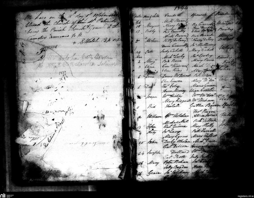 Urlingford; County of Kilkenny; Diocese of Ossory. Baptisms, Feb. 1844 to Mar. 1844