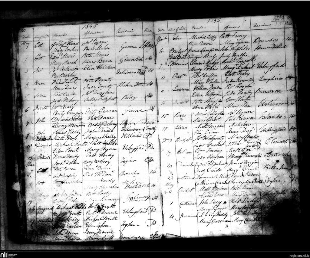 Urlingford; County of Kilkenny; Diocese of Ossory. Baptisms, Mar. 1845 to May 1845