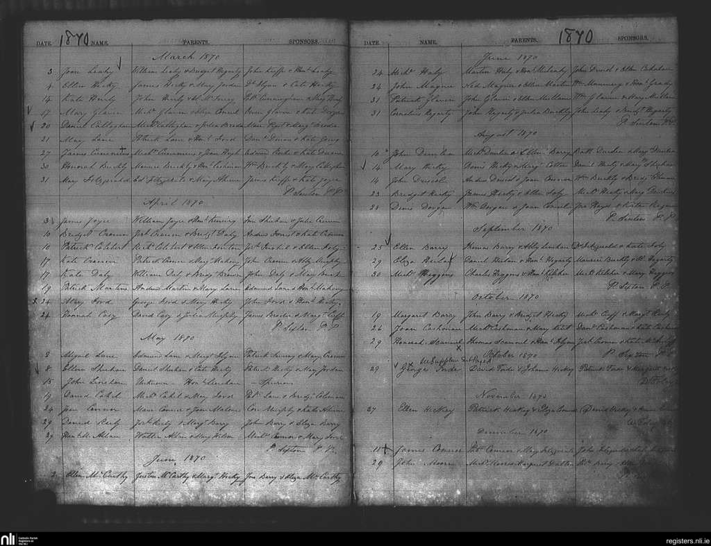 Watergrasshill; County of Cork; Diocese of Cork and Ross. Baptisms, Mar. 1870 to Dec. 1870
